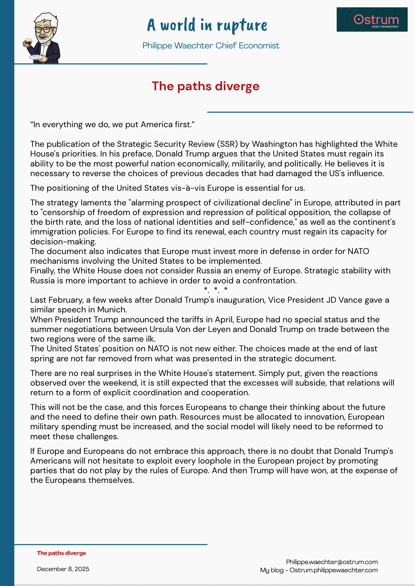 This will not be the case, and this forces Europeans to change their thinking about the future and the need to define their own path. Resources must be allocated to innovation, European military spending must be increased, and the social model will likely need to be reformed to meet these challenges.